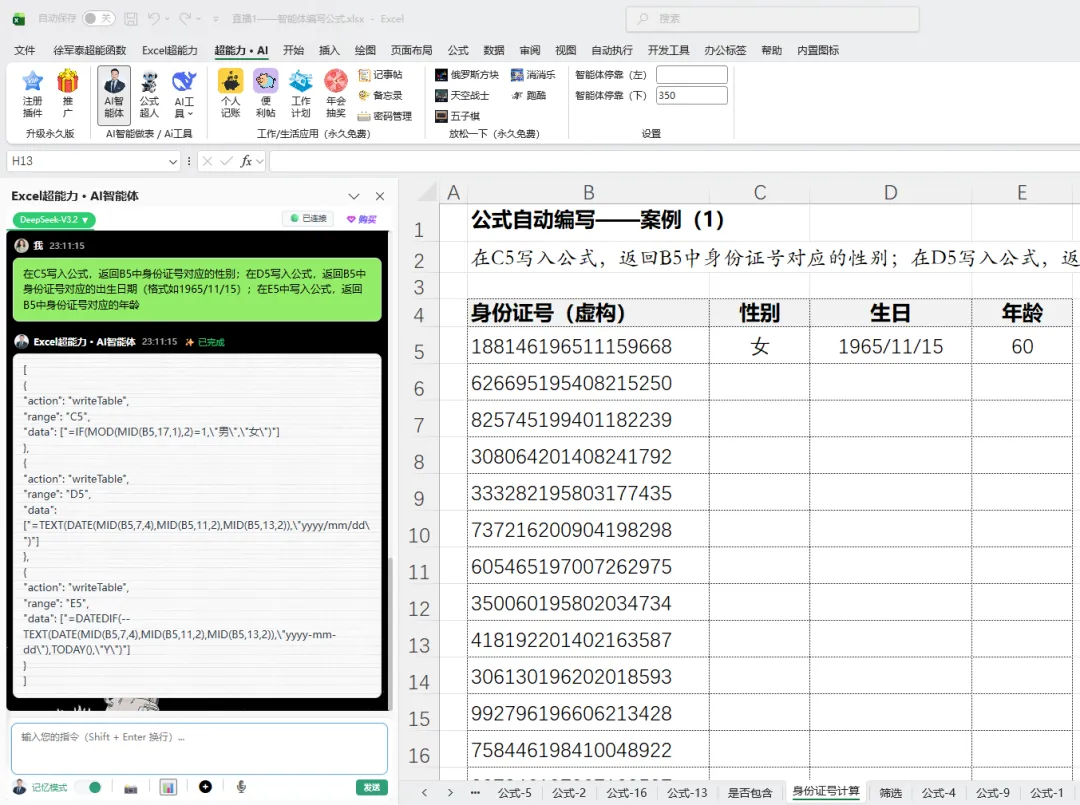 ❸ 点击【发送】按钮(或直接回车),3秒钟左右,智能体会返回一条指令,并在C5、D5、E5三个单元格中自动写入公式。