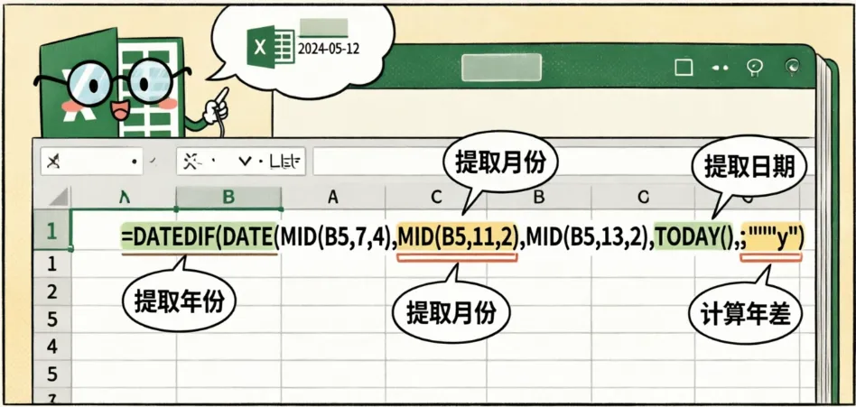 - MID(B5,7,4) → 提取第7-10位作为年份(如1990)