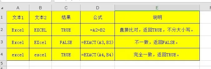 该函数测试两个字符串是否完全相同。如果它们完全相同,则返回 TRUE;否则,返回 FALSE。函数 EXACT 能区分大小写,但忽略格式上的差异。利用函数 EXACT 可以测试键入文档内的文本。语法