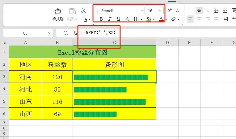 我们在制作填身份证号码的方框符号时,可以用REPT函数来生成。输入公式=REPT("£",18),字体选择为Wingdings 2。下面表格是公众号Excel学着玩的粉丝人数(纯属虚构,如有雷同,纯属巧合!)我们可以用REPT来重复竖线的次数, 然后修改特殊的字体来制作简单的条形图。输入公式=REPT("|",B3),重复竖线次数,然后把字体修改为Stencil字体。三、数据比对