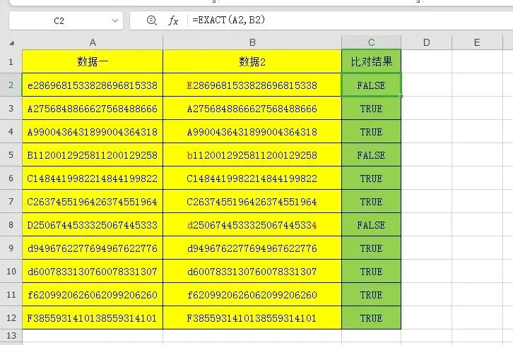 如下面两列数据,需要比对是否一致,这里面有数字,有字母,字母还分大小写,如果直接比对,可能会出现误差,得到不正确的结果。如果用你的两只大眼睛看,嗯,费劲不说,也不敢完全保证看的准确。这个例子就可以用到EXACT函数了,这里就可以输入公式=EXACT(A2,B2)。然后再运用简单的快速筛选,筛选TRUE或FALSE快速地得到想要的比对结果 。好了,今天就聊到这,这2个函数很简单,很容易掌握,平时我们在工作中也经常用到,小伙伴们要多加练习,熟练掌握他们的用法和需要注意的事项。有什么不懂的地方,或在工作中遇到的实际问题,打到评论区,让我们一起搞定他!