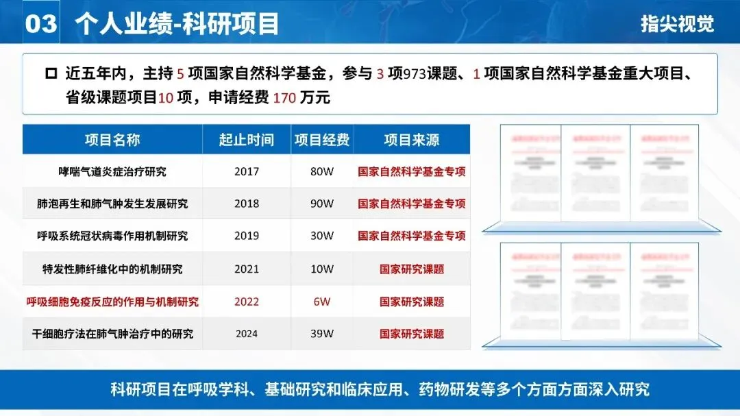 数字要“跳”出来: 模板中“5项国自然”“170万元”“79篇论文”“30余篇SCI”全部用大字号、加粗、配图的形式呈现。评委可能记不住你说了什么,但一定会记住这些数字。