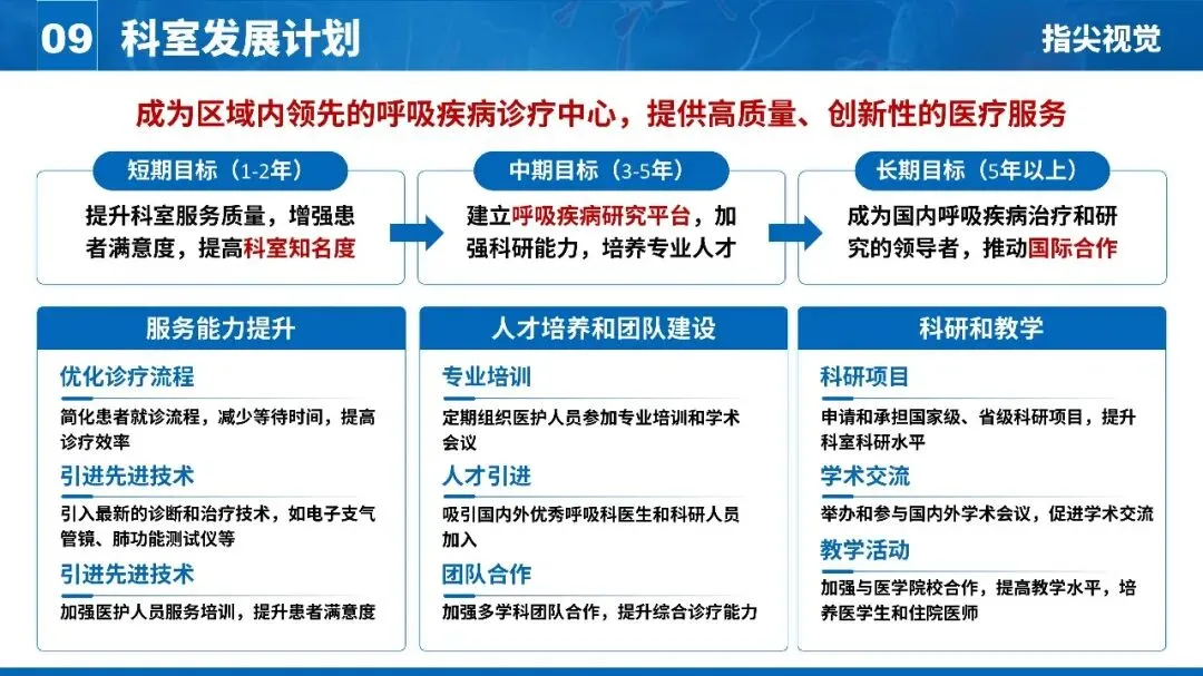 具体措施: 每个阶段下面对应2-3条具体行动,如“引进电子支气管镜”“举办学术会议”“申请国家级课题”。避免空话,每一条都要可执行。