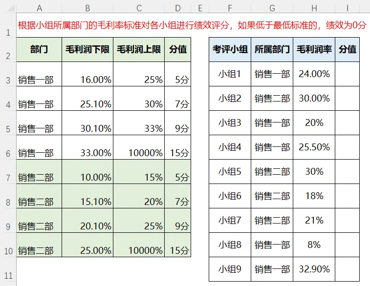 题目:请在I列输入公式,计算每个考评小组的分值是多少。