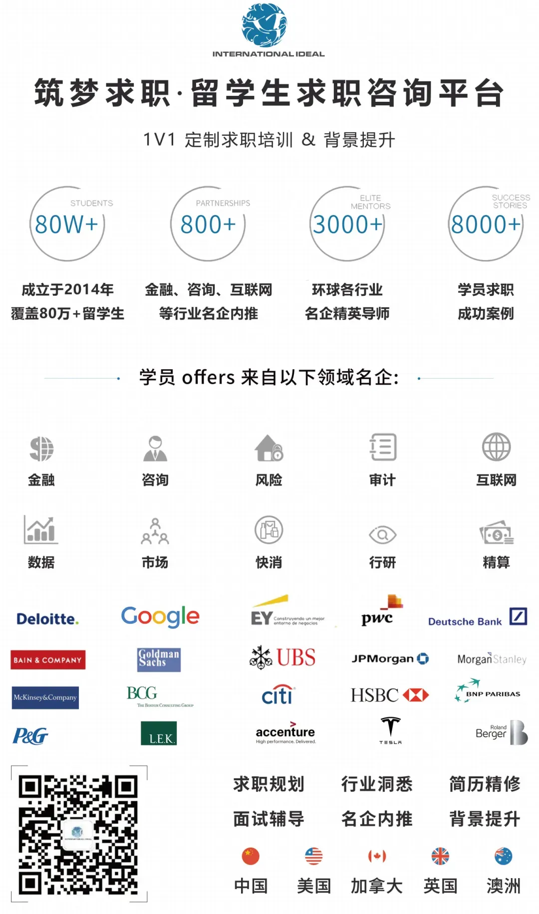 筑梦 INTERNATIONAL IDEAL(2014年成立并注册于美国),是北美最早成立的留学生求职咨询平台之一,目前覆盖全球留学生超过80万人。我们荣登“福布斯华人精英TOP100”以及“胡润百富创业领袖”榜单,至今已帮助 8000+ 学员获得来自Goldman Sachs、McKinsey、Deloitte、P&G、Google、Meta等名企的Offers。我们的服务包括:求职辅导、背景提升、名企内推、海外游学等;商务合作请联系:Coop@internationalideal.com
