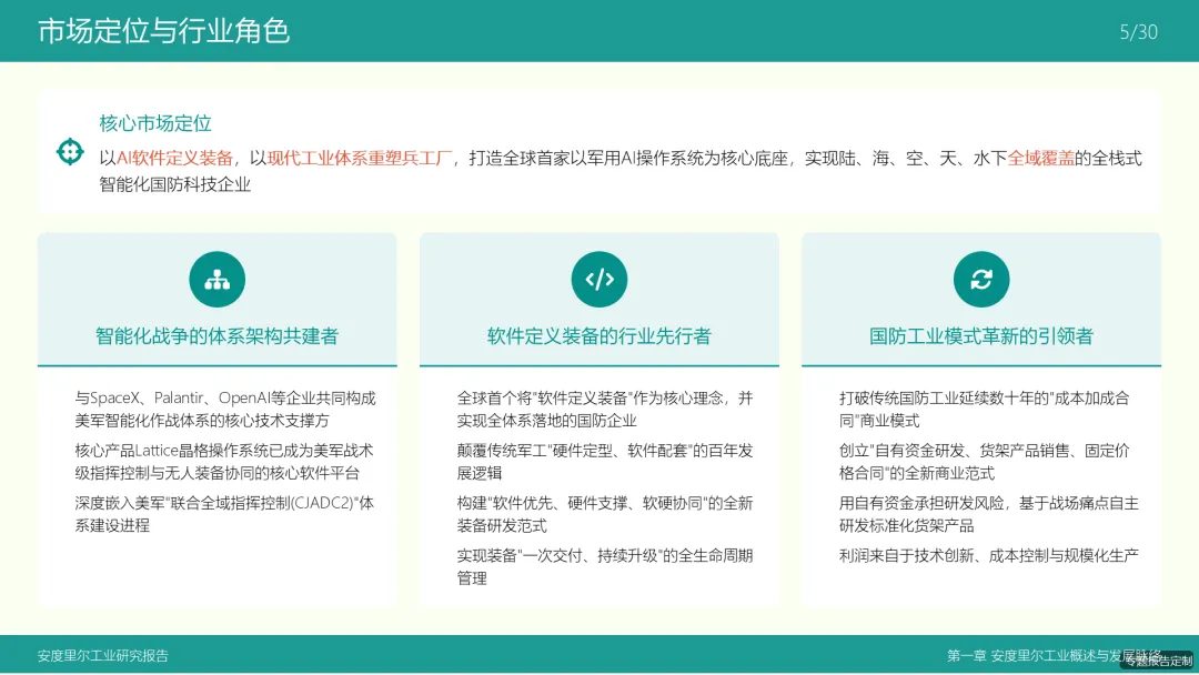 在美军智能化作战体系中,Anduril 扮演了三大核心行业角色,彻底打破了传统国防承包商的业务边界与行业定位: