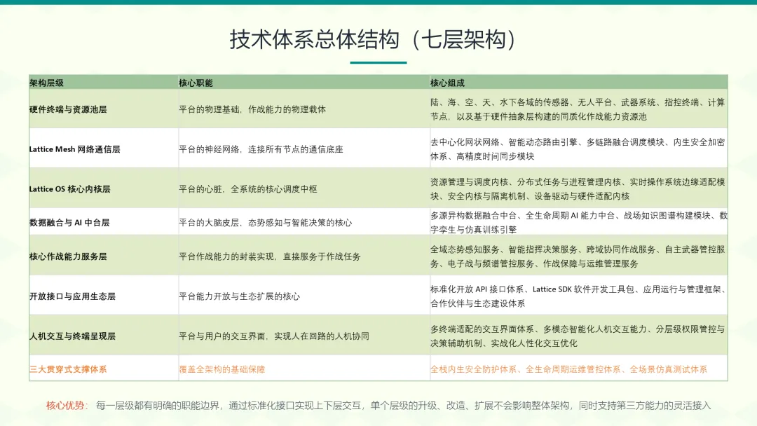 Lattice 晶格平台并非单一的指挥控制软件,而是由Lattice OS 核心操作系统与Lattice Mesh 去中心化网状网络两大核心模块构成的完整技术体系,其技术壁垒贯穿了从底层硬件接入、数据传输处理、边缘智能决策到跨域协同作战的全流程,形成了传统军工企业与同类科技公司难以短期复刻的护城河。