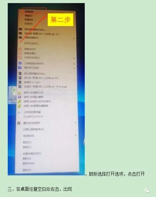 第二种方法:在电脑桌面找到Excel图标,鼠标右击,出现对话框,找到打开选项,鼠标挪至到打开选项,鼠标左击。