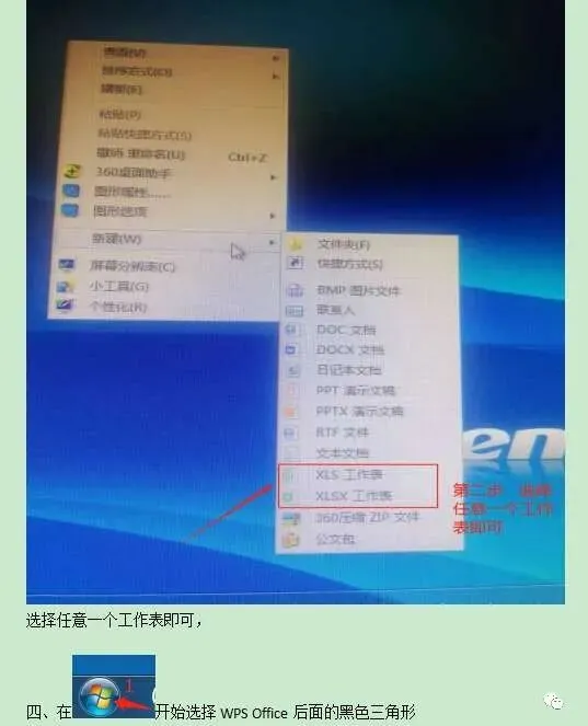 第三种方法:在桌面任意空白处鼠标右击,出现对话框,找到“新建”选项,鼠标点击“新建”选项,出现对话框,再找到“XLS工作表”和“XLSX工作表”两个选项,点击任意一个选项,即可打开工作表。