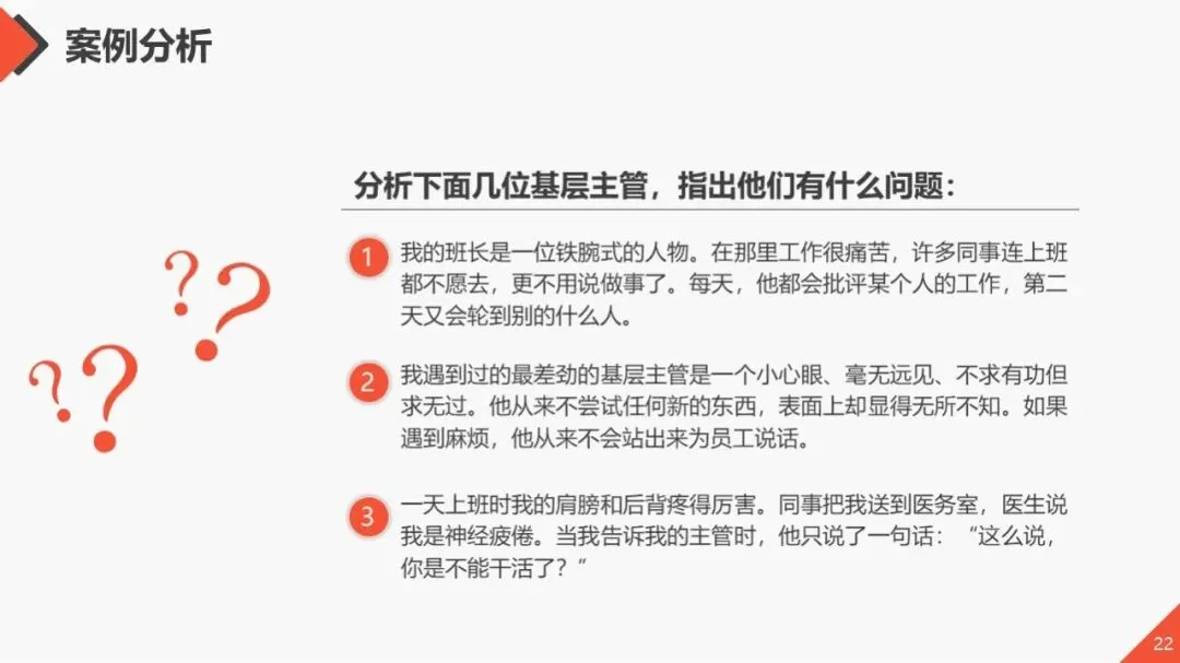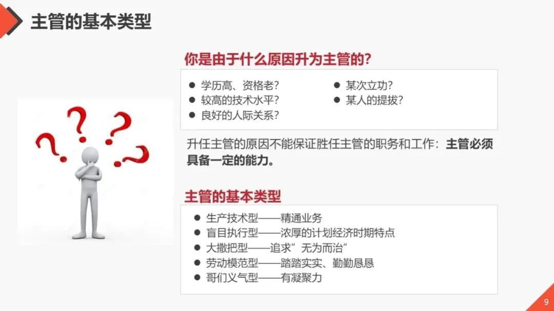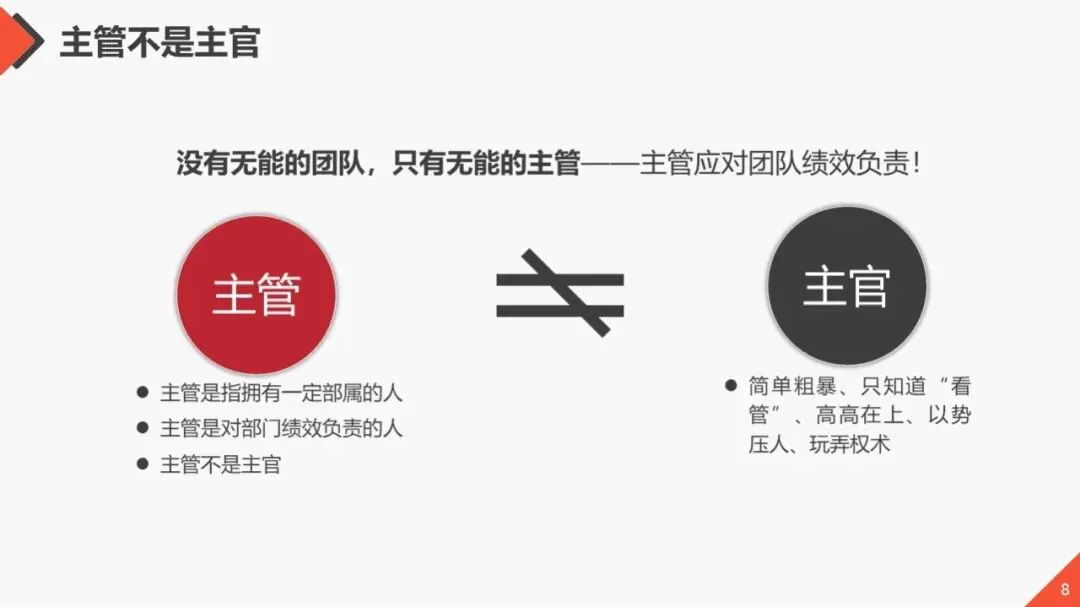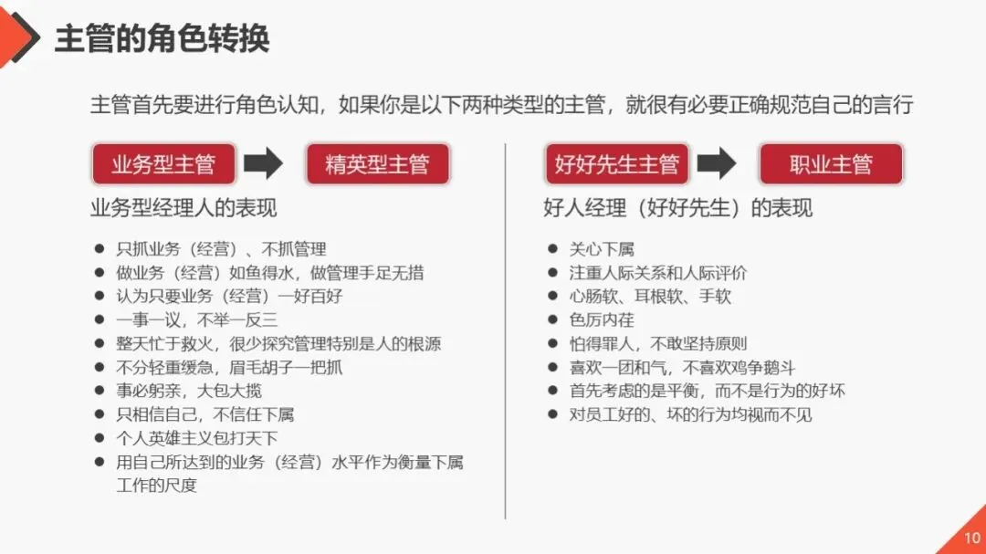 比如业务型主管只抓业务、不重管理,事必躬亲、大包大揽,陷入 “个人英雄主义”,忽视了团队的培养;好好先生主管怕得罪人、不敢坚持原则,一味追求一团和气,对员工的好坏行为视而不见,导致团队缺乏规矩、效率低下;还有盲目执行型主管机械落实上级指令,缺乏独立思考,大撒把型主管放任自流、疏于管理,这些都是基层干部的大忌。