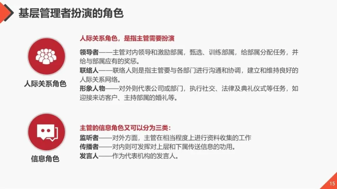 在组织中,基层干部需扮演三大核心角色:一是人际关系角色,作为领导者激励下属、培养团队,作为联络人协调内外部关系,作为形象人物代表部门树立良好形象;二是信息角色,作为监听者收集内外部信息,作为传播者做好上下信息传递,作为发言人准确传达部门立场;三是决策角色,作为创业者推动团队创新改进,作为问题处理者应对突发状况,作为资源分配者合理调配人、财、物,作为谈判者处理各类合作与冲突。