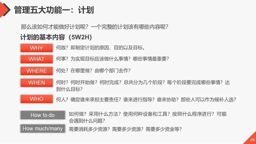 制定计划需遵循5W2H 原则,明确做计划的原因(Why)、工作内容(What)、执行地点(Where)、完成时间(When)、负责人(Who)、执行方法(How to do)、资源投入(How much),让计划具备可操作性。