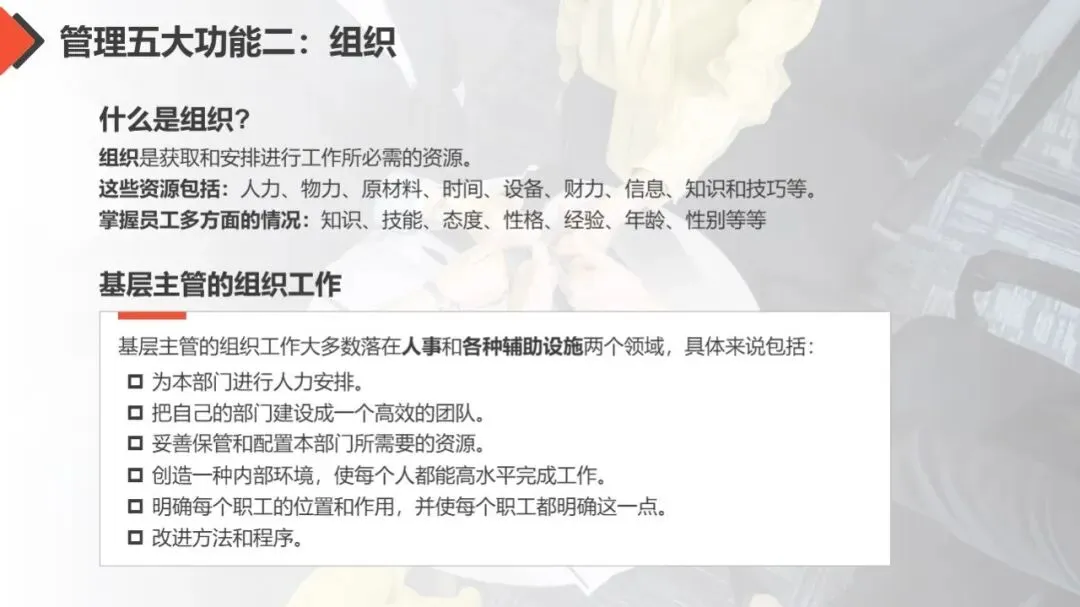 组织的核心是获取并合理安排工作所需的各类资源,包括人力、物力、财力、时间、信息等,让资源发挥最大价值,同时打造高效的团队。