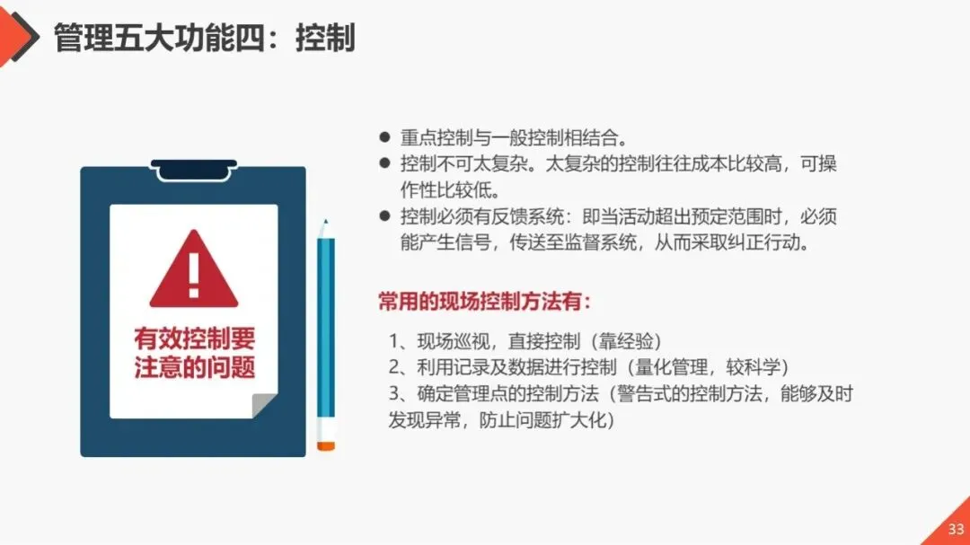 有效控制要注重方式方法:一是重点控制与一般控制相结合,聚焦核心工作和关键节点,避免面面俱到、抓小放大;二是控制要简单易行,过于复杂的控制会增加管理成本,降低可操作性;三是建立反馈系统,当工作超出预定范围时,能及时发出信号,采取纠正措施。