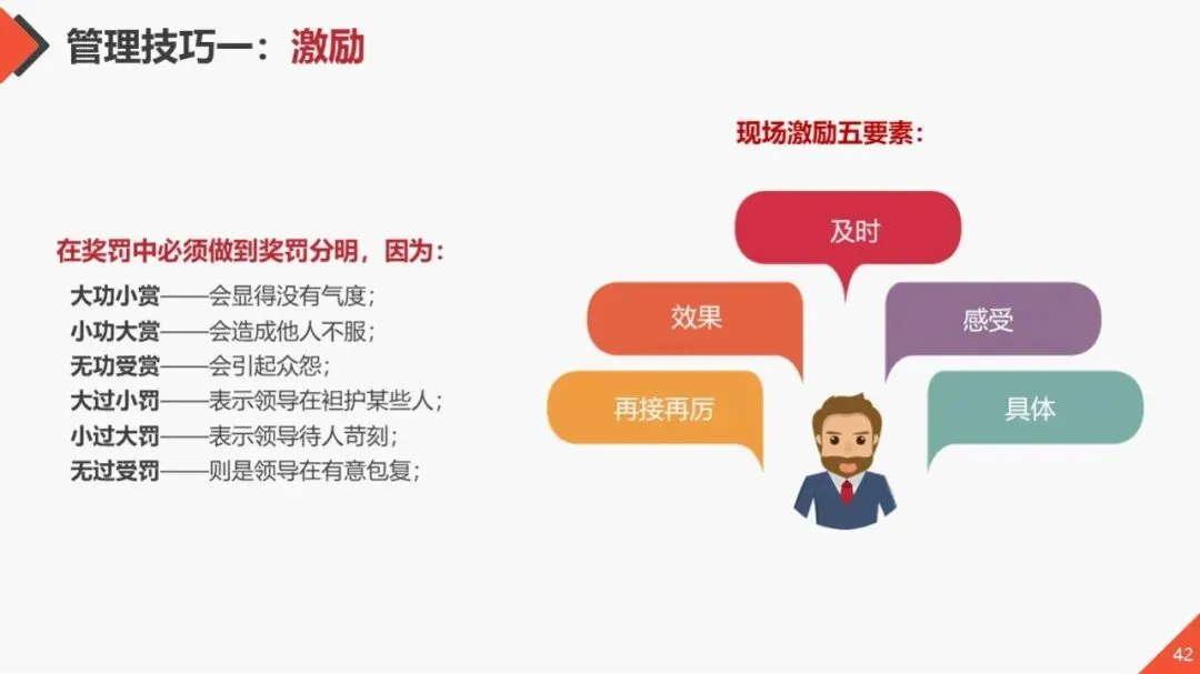 现场激励要把握 “及时、具体、效果、感受、再接再厉” 五要素,奖罚要分明,避免大功小赏、小过大罚,让激励真正发挥作用。