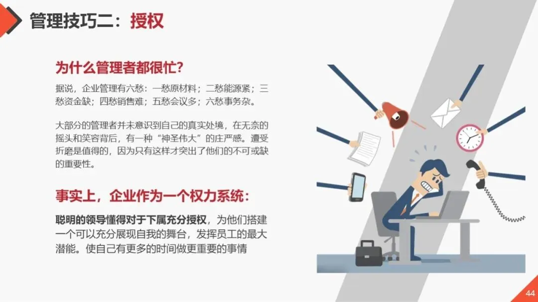 很多基层干部整天忙得焦头烂额,而员工却无所事事,根源在于不愿授权、不会授权,陷入了 “事必躬亲” 的误区。