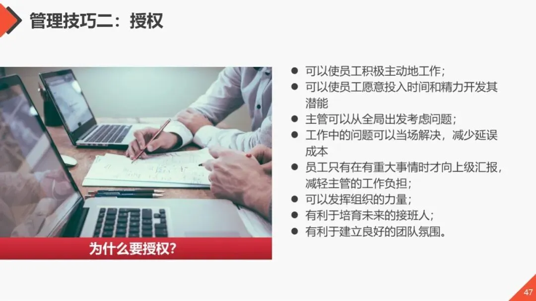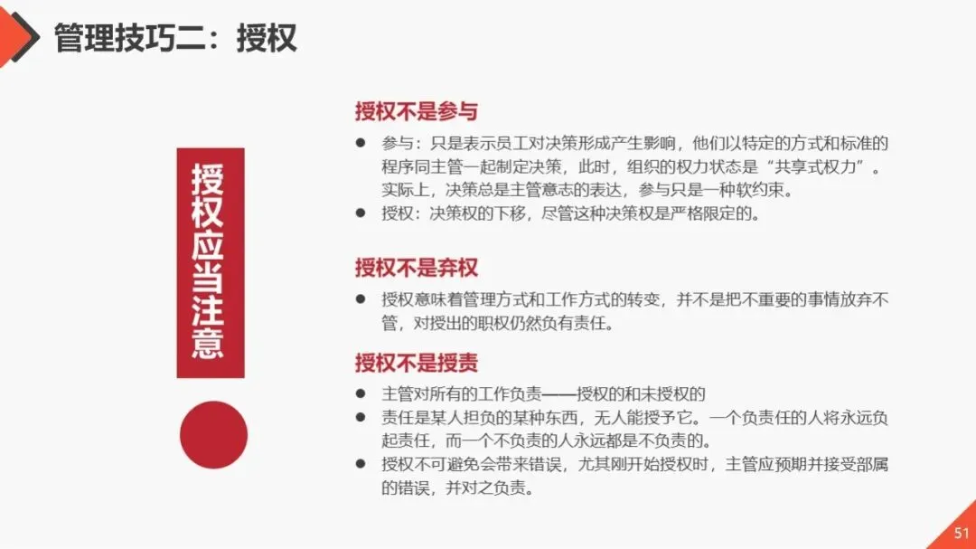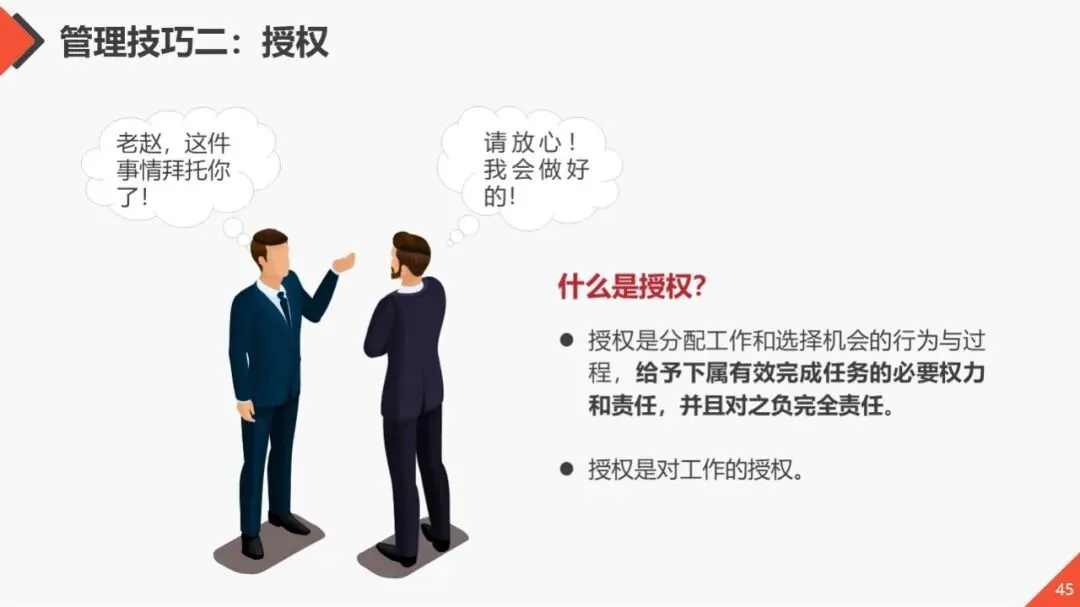 授权的核心,是将工作和相应的权力合理分配给下属,让下属承担相应的责任,并非放任不管,而是让基层干部从琐碎的事务中解脱出来,聚焦于更重要的管理工作,同时培养下属的能力。