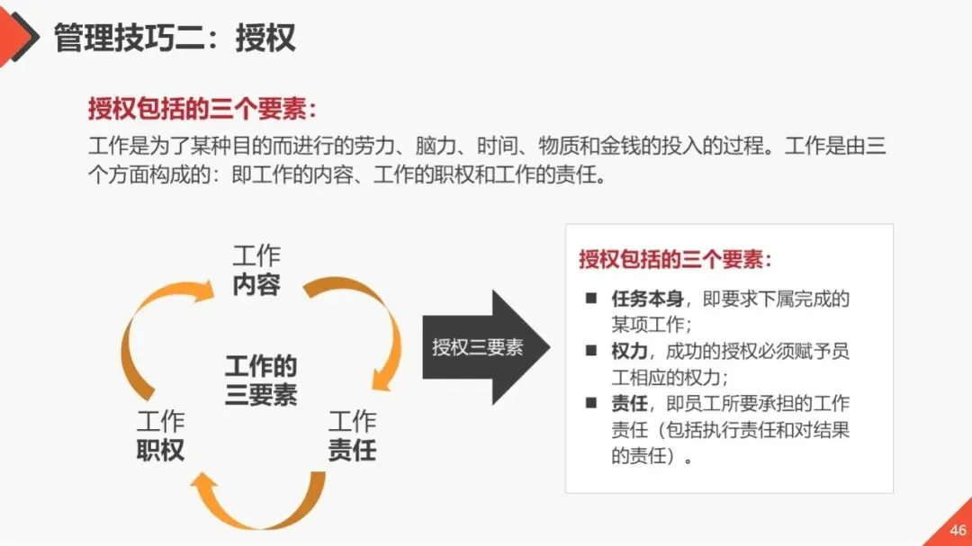 授权要把握三大核心要素:任务、权力、责任,明确让下属完成的具体任务,赋予下属完成任务所需的权力,同时让下属承担执行和结果的责任,三者缺一不可。