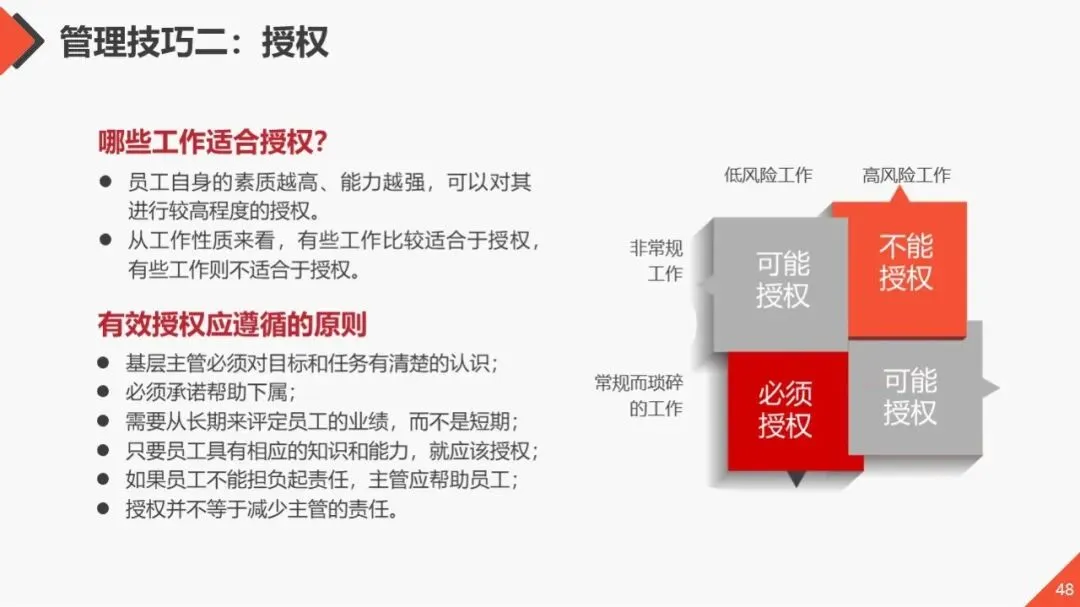 基层干部要学会区分适合授权的工作:常规琐碎的工作、低风险的工作、员工有能力完成的工作,应大胆授权;而高风险的工作、核心的决策工作,则不宜授权。
