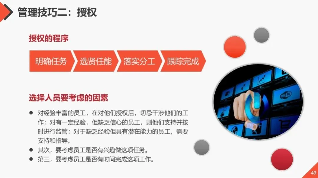 授权要遵循 “明确任务 — 选贤任能 — 落实分工 — 监督完成” 的程序,根据员工的经验、能力、兴趣合理分配任务,对经验丰富的员工充分放权,对缺乏经验的员工给予指导和支持。