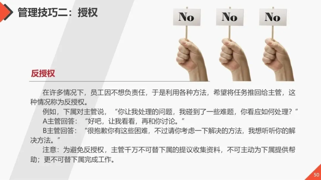 授权要规避三大误区:一是反授权,避免下属将问题推回给自己,面对下属的求助,应引导其自己思考解决方案,而非直接替下属解决问题;二是授权不等于参与,参与是员工参与决策,而授权是决策权的下移,要让下属真正拥有自主决策的空间;三是授权不等于弃权、授责,基层干部对授出的工作仍负有最终责任,要做好监督和把控,同时不能将自身的责任转移给下属。