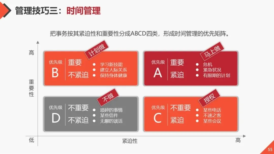 很多基层干部陷入 “忙而盲” 的状态,根源在于时间被大量无关紧要的事情占据:会议拖延、下属频繁请示、事必躬亲、分不清工作主次…… 有效管理时间,就是要合理分配时间,将时间用在最有价值的工作上。
