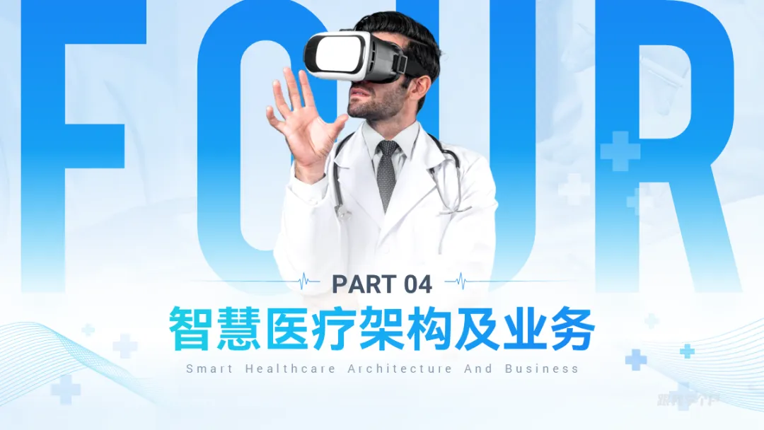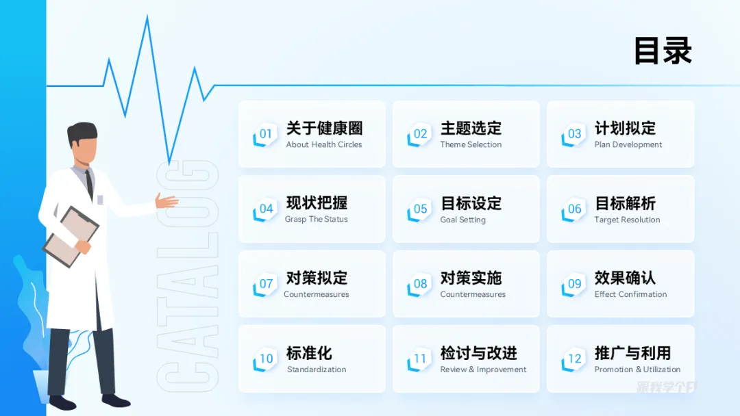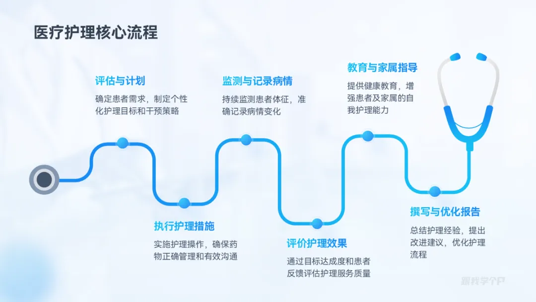 同样思路的还有这页医疗主题的流程页,相同的方法设置轴线,再结合听诊器素材,创意瞬间就出来了。