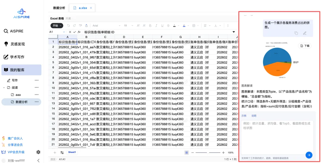 打开表格 -> 找字段 -> 手动筛选 -> 看结果 -> 再换个条件重新看一遍。只要你的 Excel 文件已经上传到“我的智库”,打开文件后,就可以直接在右侧对话区提问,让 AIspire 基于整张表格进行分析。你不需要先做复杂操作,也不需要在 Excel 和别的分析工具之间来回切换。很多原本要自己筛、自己数、自己比较的事情,现在可以先通过对话快速完成第一轮分析。它的价值不只是“方便”,而是能更快帮你从表格进入结论。