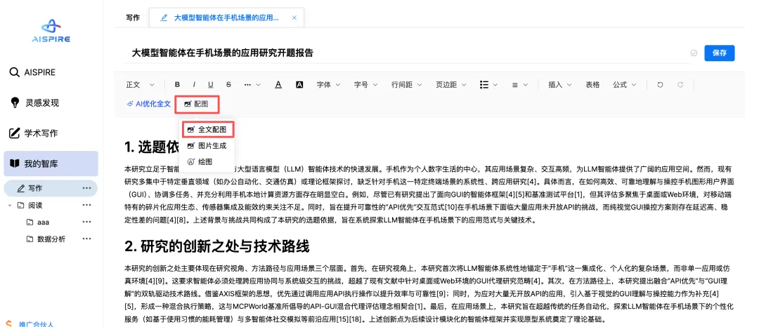 写论文、写综述、写报告时,很多人都会遇到同一个问题:这次升级后,在 AI 辅助生成全文之后,你可以直接在编辑器工具栏点击:再次执行时,优先替换旧的 AI 配图,便于继续优化这意味着,配图不再是“写完以后再单独处理的一件事”,而是可以被整合进全文生成和优化流程里的一个步骤。现在,可以先让系统帮你把整篇文章的插图框架搭起来,再在这个基础上微调。对于综述、方法章节、研究框架说明、初稿润色,这会节省很多时间。