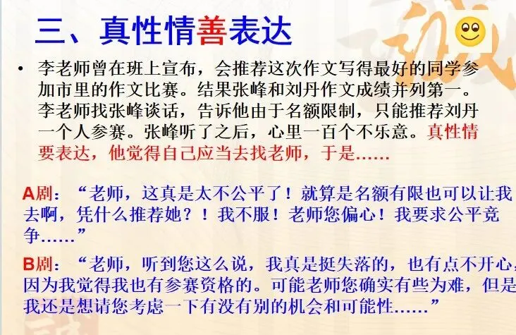 想必作为心理老师,讲“表达情绪要恰当”相关主题时,您可能也上过类似情境或者说最后要让学生用非暴力沟通或者最后引导学生学会用描述“事实+感受+期待”等方式与人沟通。