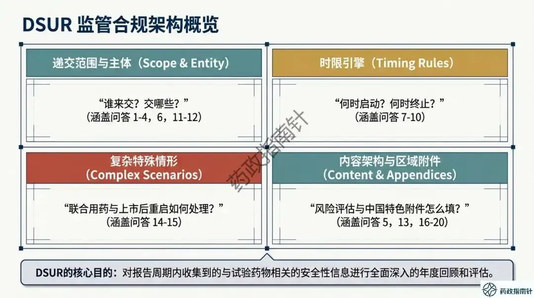 DSUR的核心目的,是对报告周期内收集到的相关安全性信息进行全面深入的年度回顾 。它不仅是一份合规文件,更是一份动态的“获益-风险评估报告”。接下来的PPT内容,将带您用PPT读懂2026年DSUR的最新监管脉络。