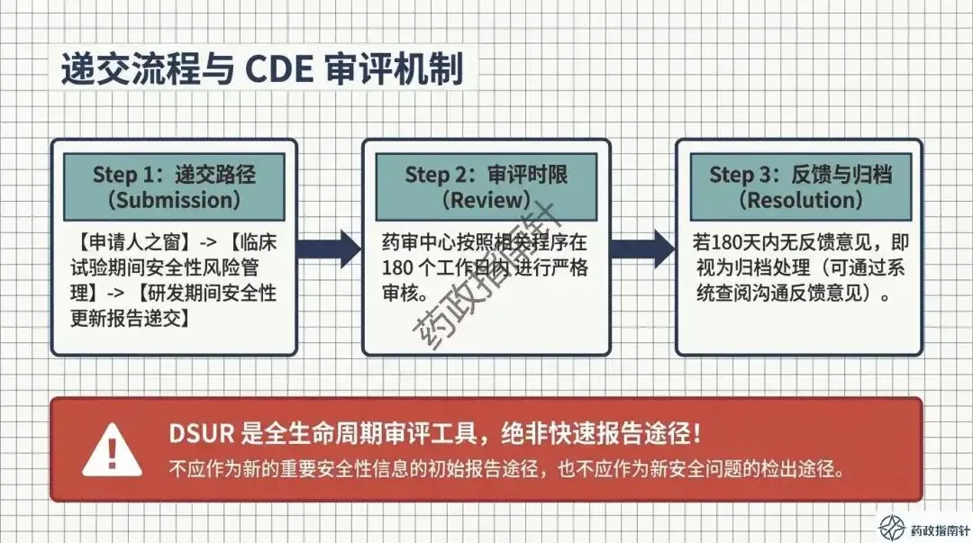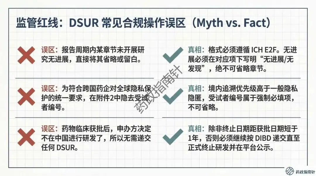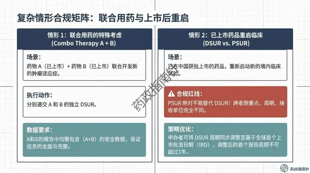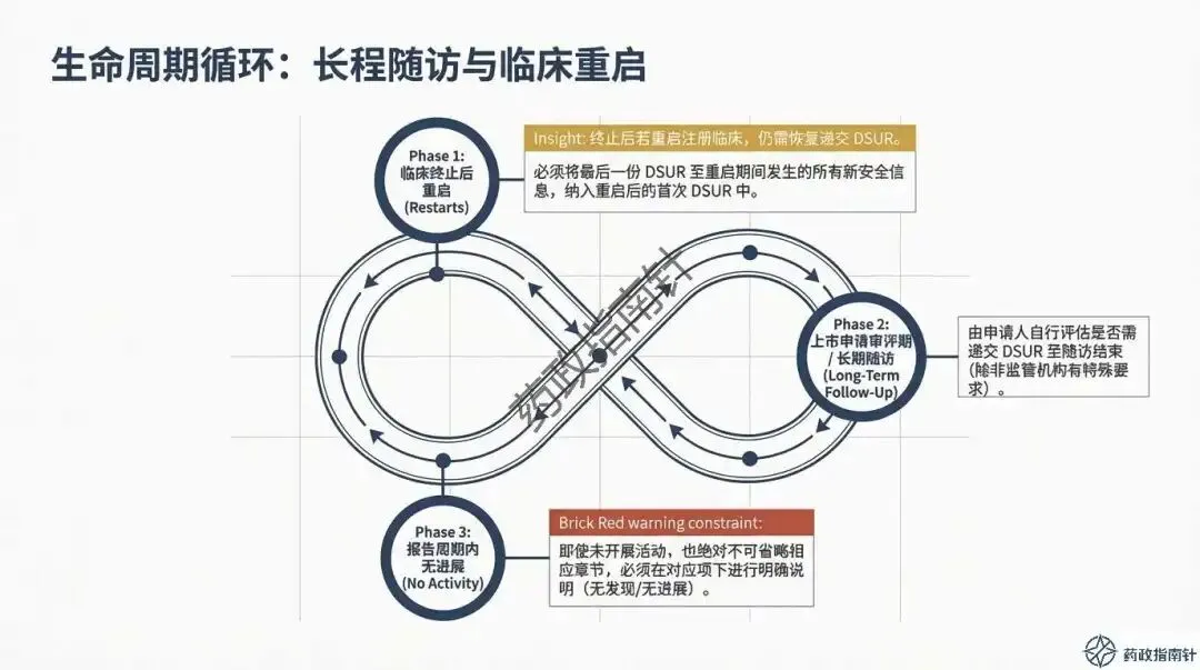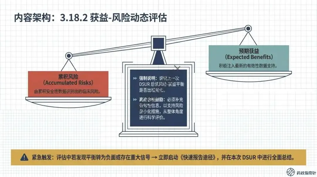 其次是动态风险评估的深度。根据最新的合规鼓励方向,申办者不应仅列出累积风险,更应积极注入最新的有效性数据支持,进行“获益-风险动态评估” 。如果评估中发现风险-获益平衡转为负面,或者出现了重大安全性信号,绝不能等待DSUR的年度报告,而必须立即启动《快速报告途径》 。