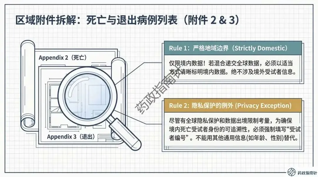 区域附件的合规细节:重点剖析了“中国特色”附件的要求,包括境内死亡病例列表的填写规范,以及在隐私保护前提下如何确保受试者编号的可追溯性。