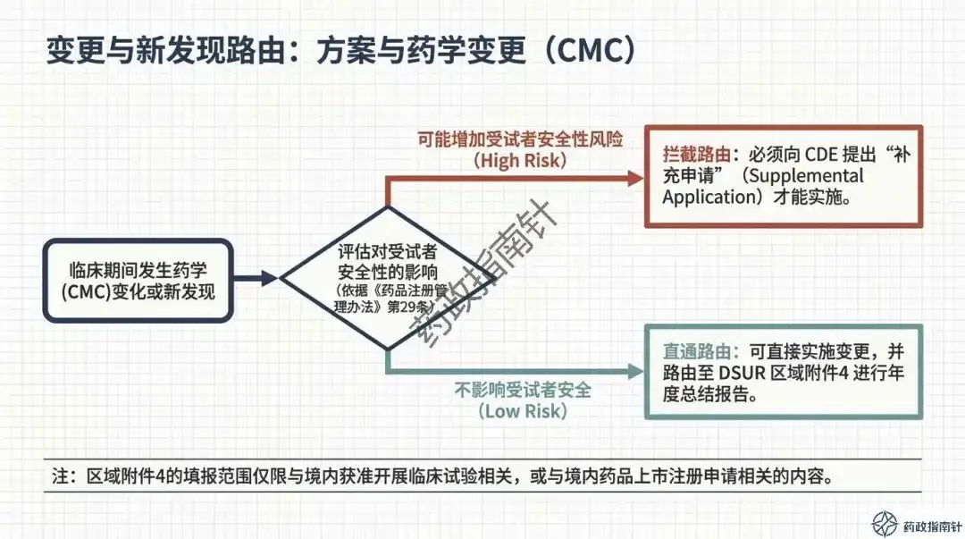 变更路径的合规路由:当临床期间发生药学变更(CMC)或方案调整时,究竟该通过DSUR报告还是递交补充申请?我们为您梳理了清晰的判断逻辑 。
