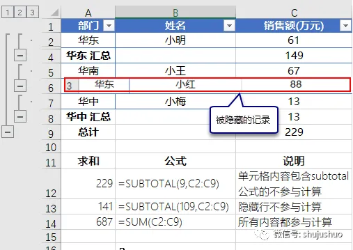 示例中,在对分类汇总区域进行求和时,sum函数对所有数据求和,而subtotal函数会自动忽略汇总小计项;对于隐藏记录行,参数109会忽略求和,而参数9不忽略。