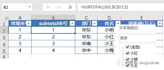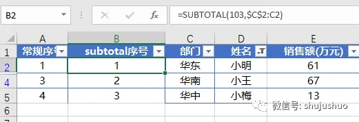 SUBTOTAL 函数之所以能被叫做统计之王,就在于第一个参数功能代码,参数数字 1-11 或 101-111,用于指定要为分类汇总使用的函数,包括常用的求和、计数、求平均值等等。如果使用 1-11,将包括手动隐藏的行,如果使用 101-111,则排除手动隐藏的行;始终排除已筛选掉的单元格。
