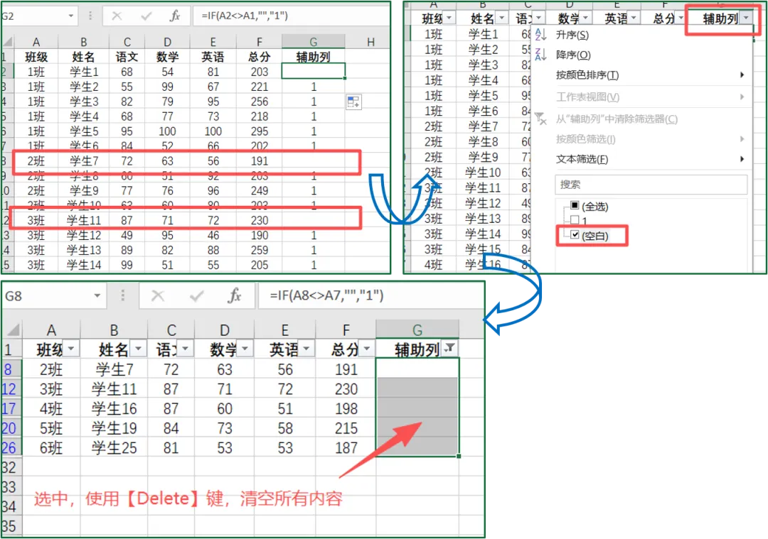 ④关键步骤!筛选【辅助列】中为“空”的单元格,按【Delete】清空内容(注意:复制粘贴为文本无法保证单元格为真正意义上的空);