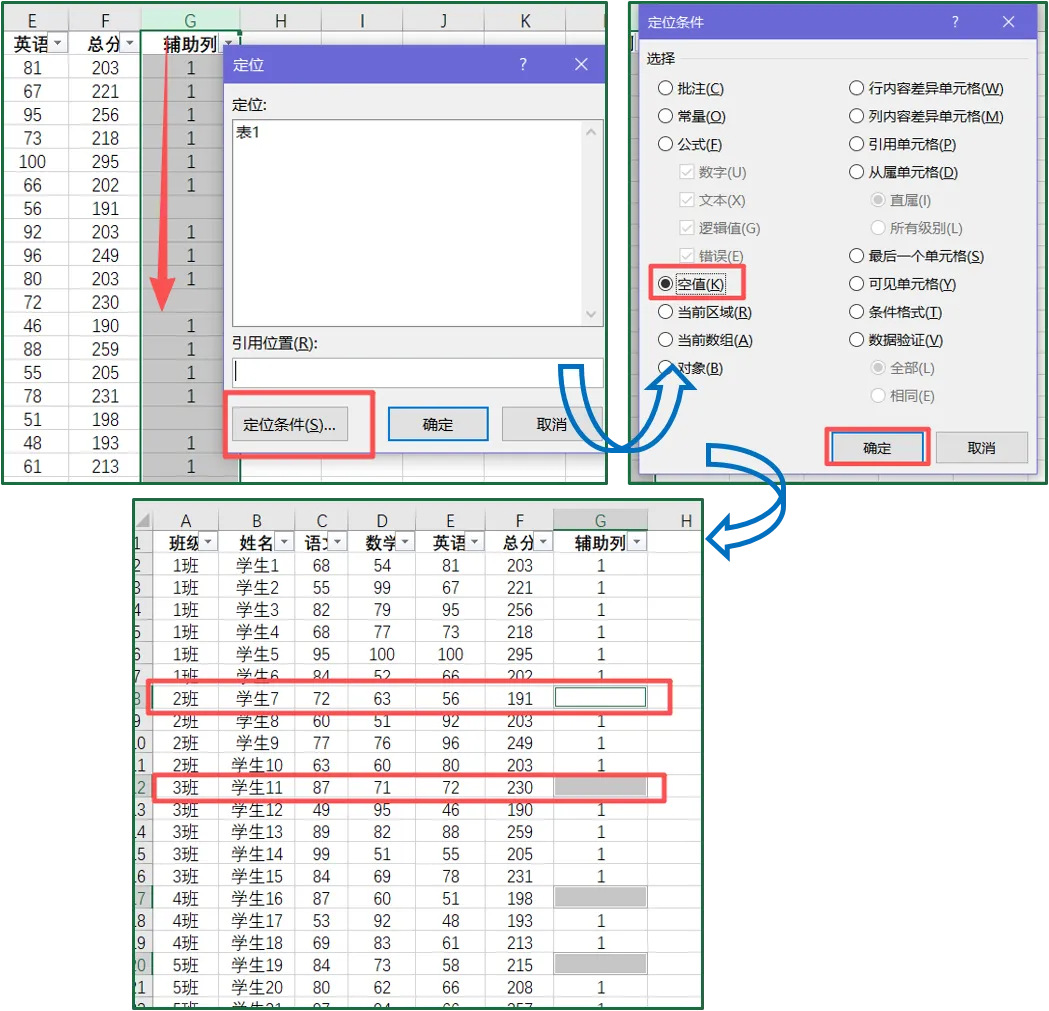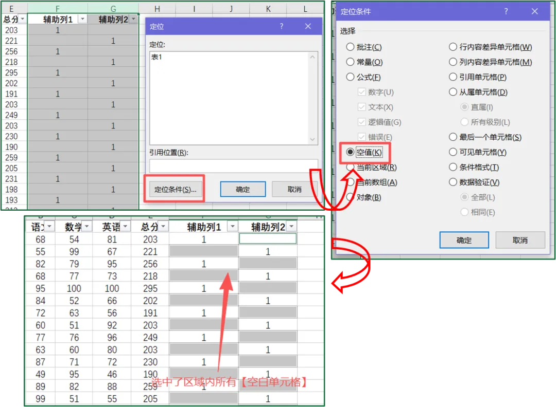 ⑤选中【辅助列1】【辅助列2】,按【Ctrl+G】,打开定位条件,依次选择【定位条件-空值-确定】;