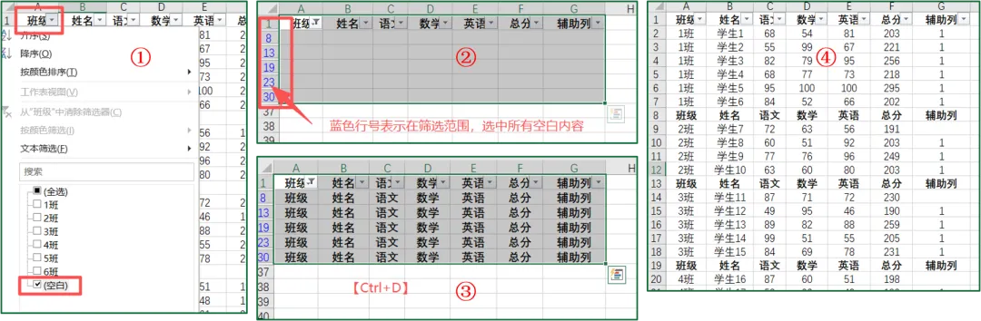 ⑦筛选A列空白行,选中【空白行+原标题行】;