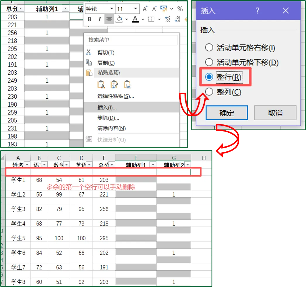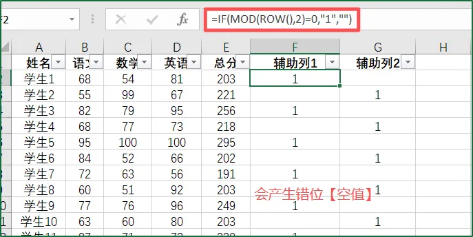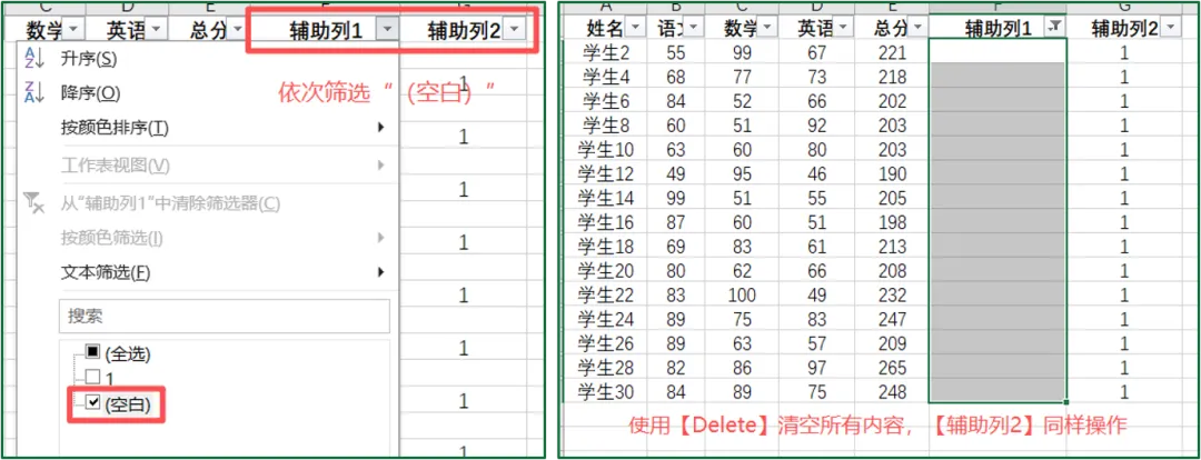 ④关键步骤!分别筛选【辅助列1】【辅助列2】中为“空”的单元格,按【Delete】清空内容(注意:复制粘贴为文本无法保证单元格为真正意义上的空);