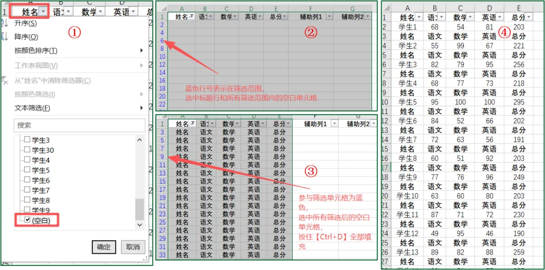 ⑦筛选【姓名】为空的行,选中【空白行+原标题行】;