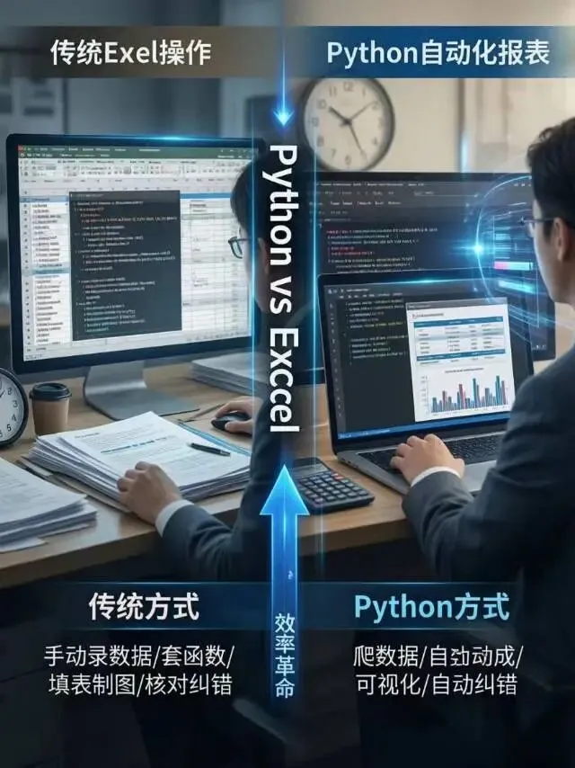 以前招聘常说“精通Excel”,现在不少岗位加了句“会Python优先”。连财务朋友都在感慨:没想到有天要学编程。 Python到底强在哪? 就说做报表:手动录数据、套函数、填表制图,忙大半天还得核对;会Python的,几行代码爬数据、自动生成表格和可视化图表,连核对纠错都能搞定,全程不到1分钟。