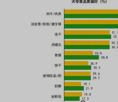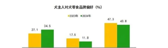 与2023年相比,犬主人对肉干/肉条的偏好的下降3.8个百分点,对洁齿骨/咬胶/磨牙棒、冻干、香肠、饼干的偏好度上升。