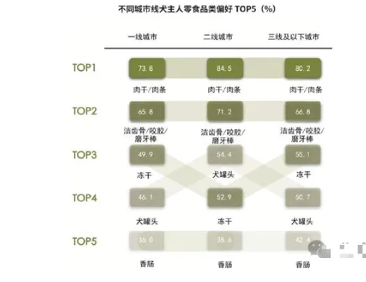 二线城市犬主人对肉干/肉条、洁齿骨/咬胶/磨牙棒以及犬罐头的偏好度高于其他城市犬主人,分别为84.5%、71.2%、54.4%.