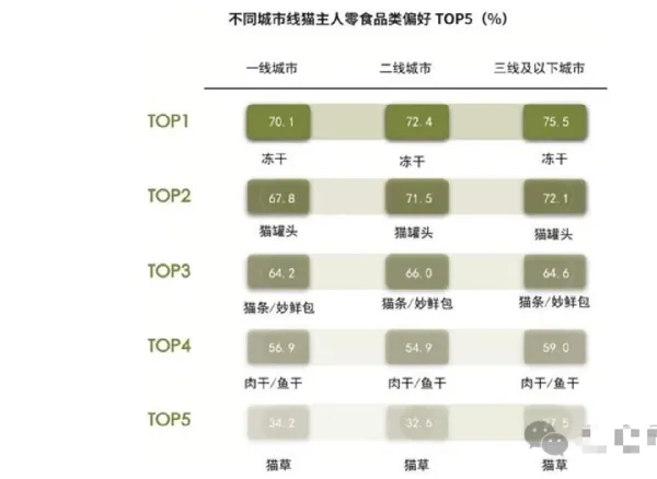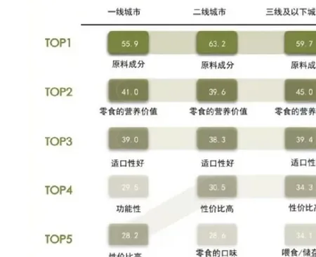 一线城市猫主人对零食功能性的关注度相对较高,进入该城市线TOP5,占比为29.5%。