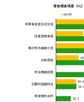 与2023年相比,选择用零食促进互动交流、偶尔作为辅食补充场景的占比有所下降,改善宠物食欲、训练奖励场景的占比有所上升。