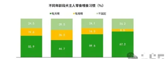 超五成的犬主人每天喂食,主要以80前宠主为主犬主人更倾向每天喂食零食,占比为52.4%,其次是不固定喂食,占比为26.7%。选择每周喂食的占比较低,为20.9%分年龄段来看,90后犬主人选择不固定喂食的占比高于其他年龄段犬主人,占比为29.0%。80前宠主选择每天喂食的占比高于其他年龄段犬主人,占比为67.2%。