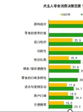 犬主人对零食时的营养价值关注度较高原料成分仍是犬主人最为关注的因素,占比为59.4%。其次是零食的营养价值因素,占比为41.2%。与2023年相比,宠主对原料成分、功能性的关注度有所下降,占比分别为59.4%、37.9%。其他零食消费决策因素占比均有不同程度的上升。