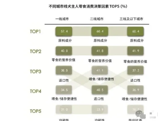 一线、二线城市犬主人对功能性零食较为关注,占比分别为31.0%、33.9%。三线及以下城市犬主人对性价比较为关注,占比为36.7%.