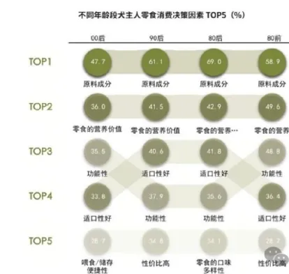 00后犬主人对零食的偏好度普遍低于其他年龄段犬主人。